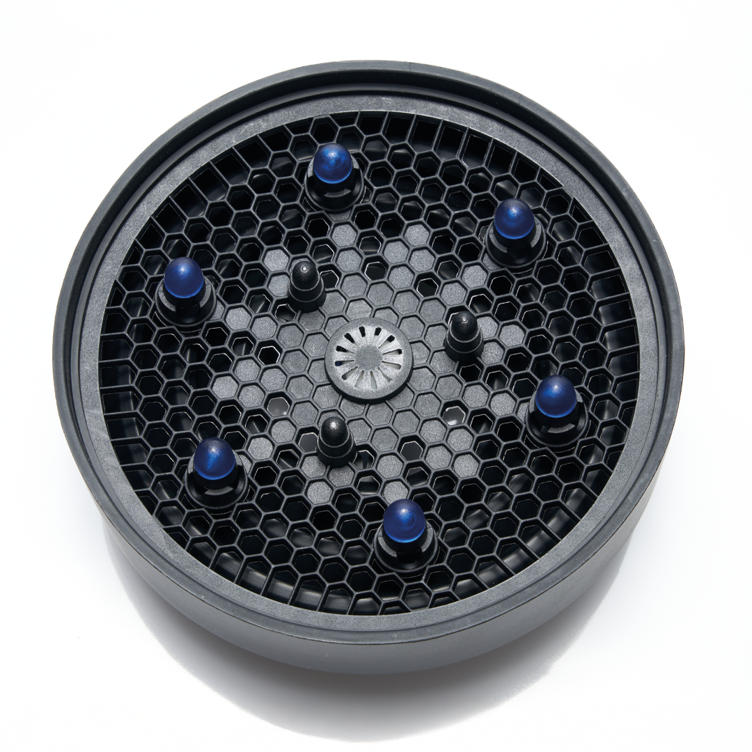 Secado Estático (Pixie Diffusing): Su diseño permite apoyar el difusor directamente sobre el cabello sin movimiento, ideal para crear cast (capa dura de producto) en melenas rizadas que requieren máxima definición.
