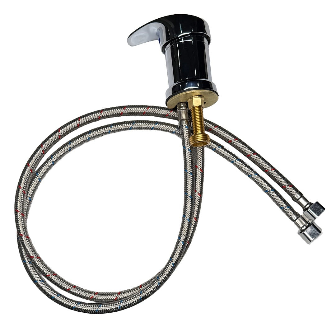 Instalación Completa y Segura: Este monomando viene listo para instalar, incluyendo las dos mangueras flexibles trenzadas de acero inoxidable para la conexión de agua fría y caliente, ya pre-conectadas. Además, el paquete incorpora un kit completo de instalación (vástago roscado, arandelas de goma para un sellado hermético y piezas de sujeción metálicas) que asegura un montaje firme, estable y sin fugas a tu lavapelos o lavabo.