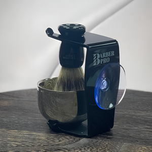 Este elegante soporte de afeitado de acrílico negro cuenta con una ventosa que permite adherirlo fácilmente a espejos u otras superficies. Incluye un hisopo de cerdas sintéticas con mango de plástico negro y cerdas de color marrón y negro, que le dan un toque vintage. Además, cuenta con un cuenco metálico para mezclar el jabón de afeitar, lo que lo convierte en un accesorio completo y funcional para tu rutina de afeitado.