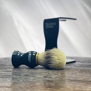 Este soporte de afeitado de acrílico negro cuenta con un diseño sencillo y funcional. Incluye un espacio para apoyar la afeitadora, lo que facilita su acceso y organización. Además, cuenta con un hisopo de cerdas sintéticas con mango de plástico negro y cerdas de color marrón y negro, que le dan un toque vintage.