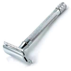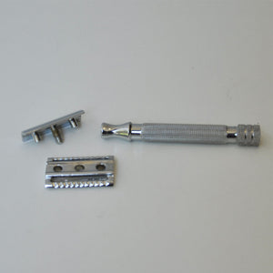 Sistema de 3 piezas:El cabezal se separa del mango en dos partes (la placa superior y la base), lo que permite colocar la cuchilla de doble filo en el medio. Aunque el cambio de cuchilla es un poco más lento que en los modelos "mariposa", este sistema es muy seguro, ya que la cuchilla queda firmemente sujeta. Además, este diseño facilita una limpieza exhaustiva de la afeitadora.